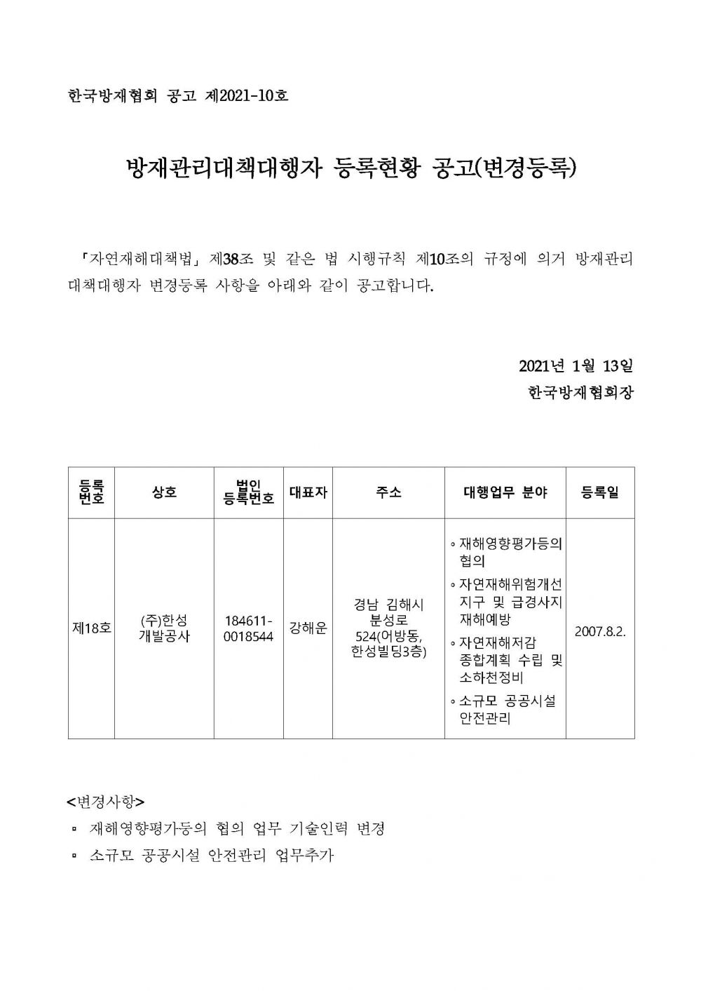 방재관리대책대행자 등록현황 공고(변경등록) - (주)한성개발공사 2021-01-13 공고문_제2021-10호_방재대행자 등록현황 공고(변경)_(주)한성개발공사.pdf (64895K) 목록보기 이전글방재관리대책대행자 등록현황 공고(변경등록) - (주)홍익기술단2021.01.18 다음글방재관리대책대행자 등록현황 공고(변경등록) - (주)용마엔지니어링2022.01.12