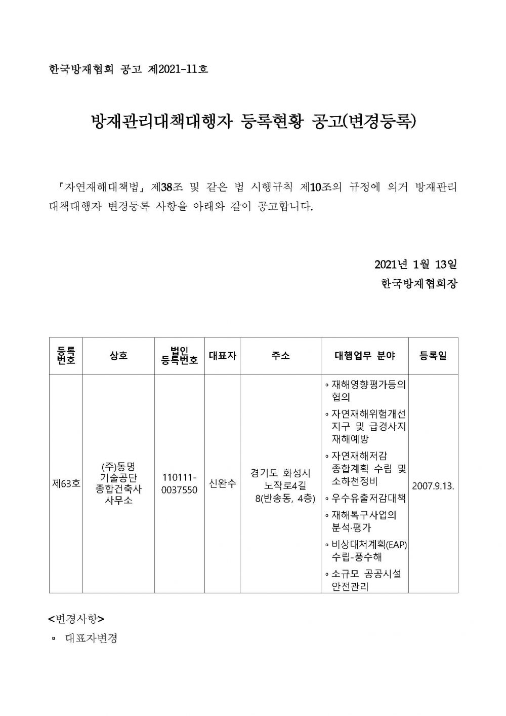 방재관리대책대행자 등록현황 공고(변경등록) - (주)동명기술공단종합건축사사무소 2021-01-13 공고문_제2021-11호_방재대행자 등록현황 공고(변경)_(주)동명기술공단종합건축사사무소.pdf (66308K) 목록보기 이전글방재관리대책대행자 등록현황 공고(변경등록) - (주)전엔지니어링2021.01.25 다음글방재관리대책대행자 등록현황 공고(변경등록) - (주)한울2021.01.11