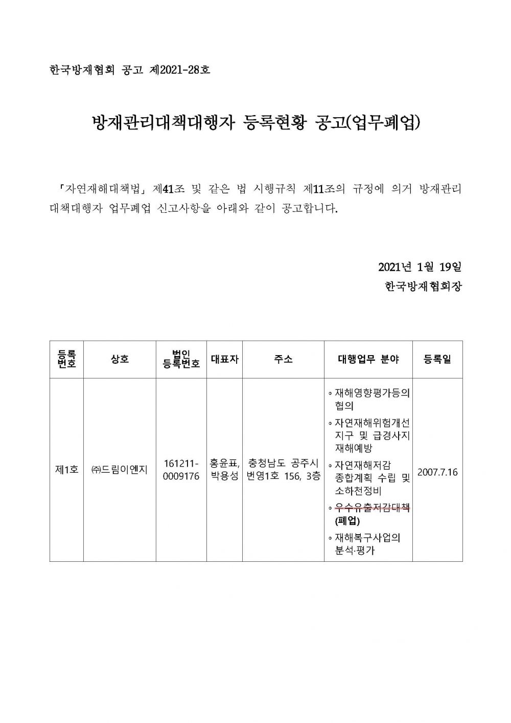 방재관리대책대행자 등록현황 공고(업무폐업) - (주)드림이엔지 2021-01-19 공고문_제2021-28호_방재대행자 등록현황 공고(폐업)_(주)드림이엔지.pdf (61201K) 목록보기 이전글방재관리대책대행자 등록현황 공고(변경등록) - (주)한신엔지니어링2021.02.01 다음글방재관리대책대행자 등록현황 공고(변경등록) - (주)동명기술공단종합건축사사무소2021.01.13