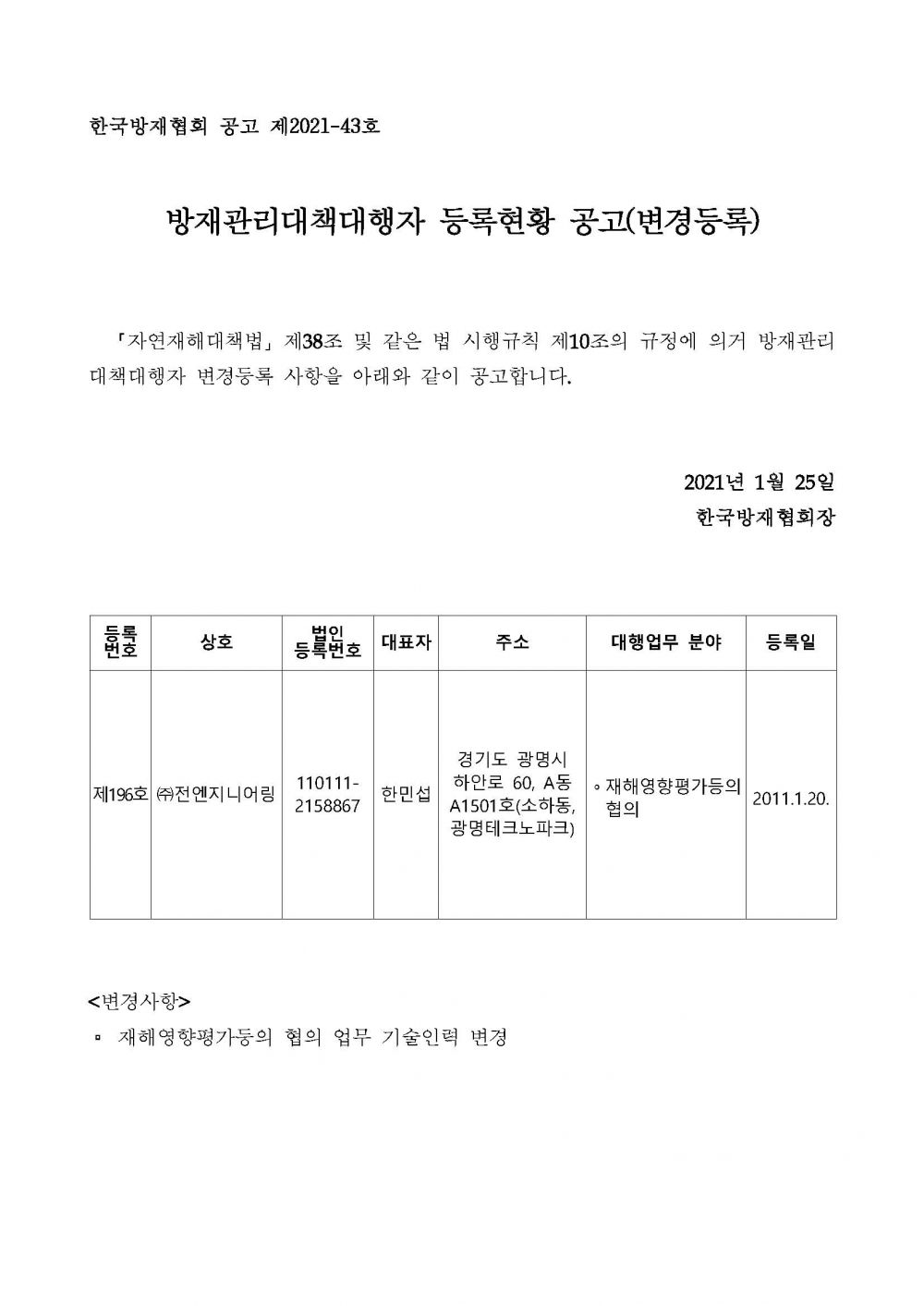 방재관리대책대행자 등록현황 공고(변경등록) - (주)전엔지니어링 2021-01-25 공고문_제2021-43호_방재대행자 등록현황 공고(변경)_(주)전엔지니어링.pdf (58310K) 목록보기 이전글방재관리대책대행자 등록현황 공고(변경등록) - (주)한신엔지니어링2021.02.01 다음글방재관리대책대행자 등록현황 공고(변경등록) - (주)동명기술공단종합건축사사무소2021.01.13