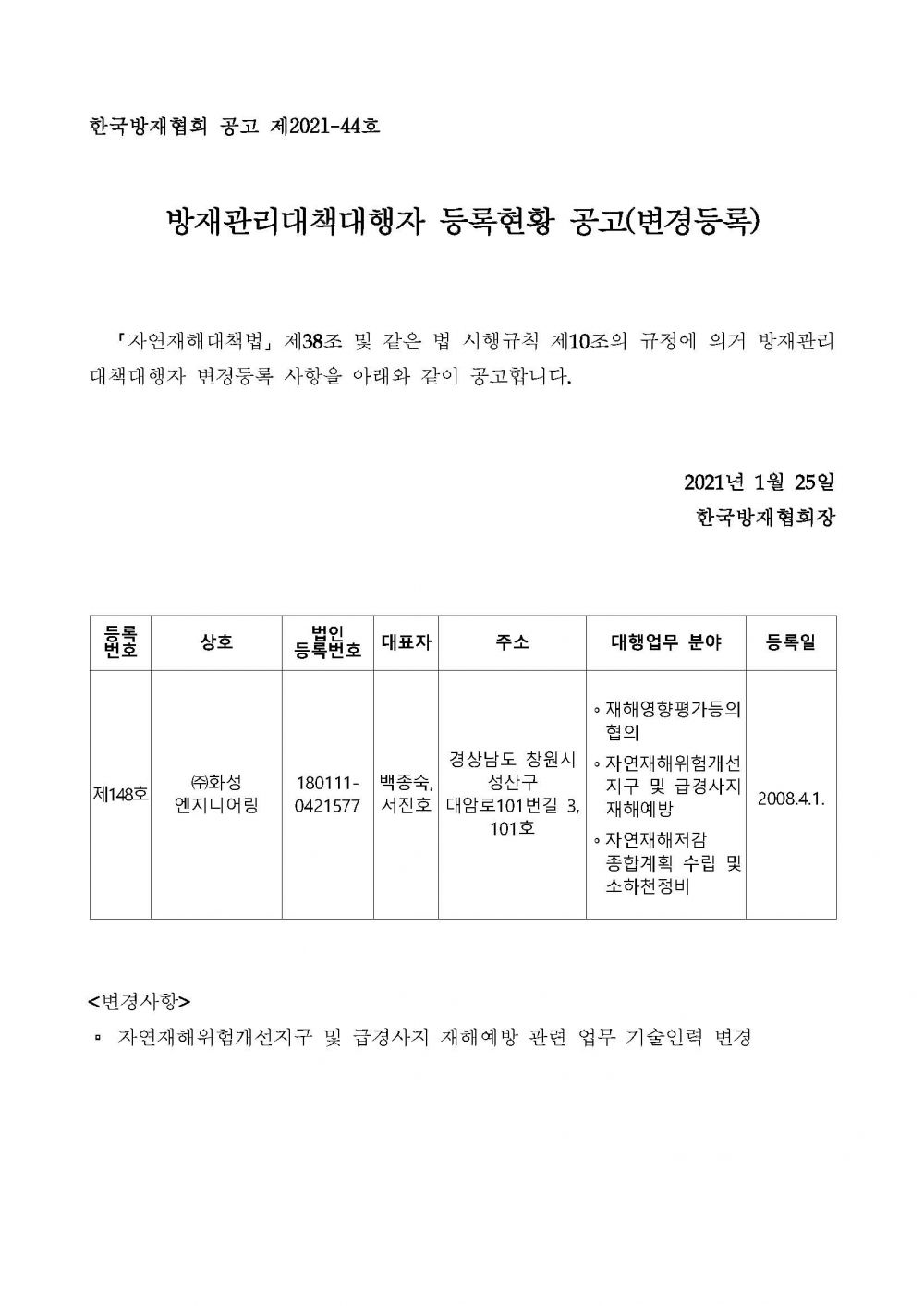 방재관리대책대행자 등록현황 공고(변경등록) - (주)화성엔지니어링 2021-01-25 공고문_제2021-44호_방재대행자 등록현황 공고(변경)_(주)화성엔지니어링.pdf (64378K) 목록보기 이전글방재관리대책대행자 등록현황 공고(변경등록) - 한국기술개발(주)2021.02.04 다음글방재관리대책대행자 등록현황 공고(업무폐업) - (주)드림이엔지2021.01.19