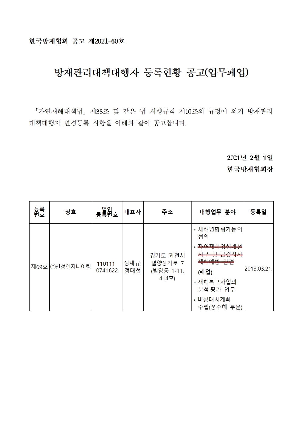 방재관리대책대행자 등록현황 공고(업무폐업) - (주)신성엔지니어링 2021-02-01 공고문_제2021-60호_방재대행자 등록현황 공고(변경)_(주)신성엔지니어링.pdf (62315K) 목록보기 이전글방재관리대책대행자 등록현황 공고(변경등록) - (주)우영엔지니어링2021.02.15 다음글방재관리대책대행자 등록현황 공고(변경등록) - (주)화성엔지니어링2021.01.25