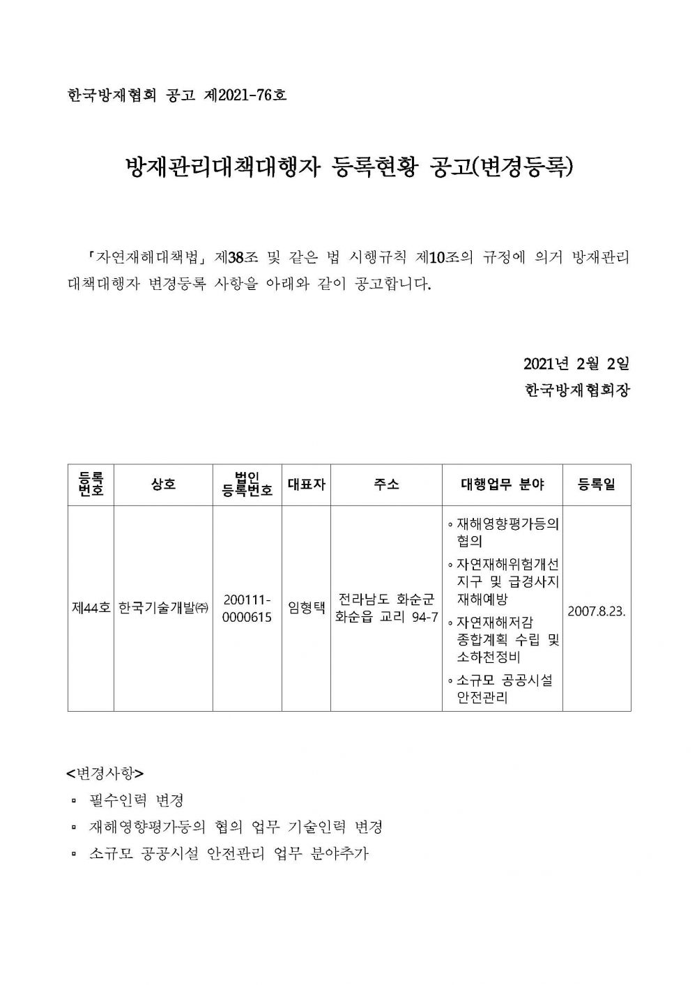 방재관리대책대행자 등록현황 공고(변경등록) - 한국기술개발(주) 2021-02-04 공고문_제2021-76호_방재대행자 등록현황 공고(변경)_한국기술개발(주).pdf (65948K) 목록보기 이전글방재관리대책대행자 등록현황 공고(변경등록) - (주)우영엔지니어링2021.02.15 다음글방재관리대책대행자 등록현황 공고(변경등록) - (주)화성엔지니어링2021.01.25