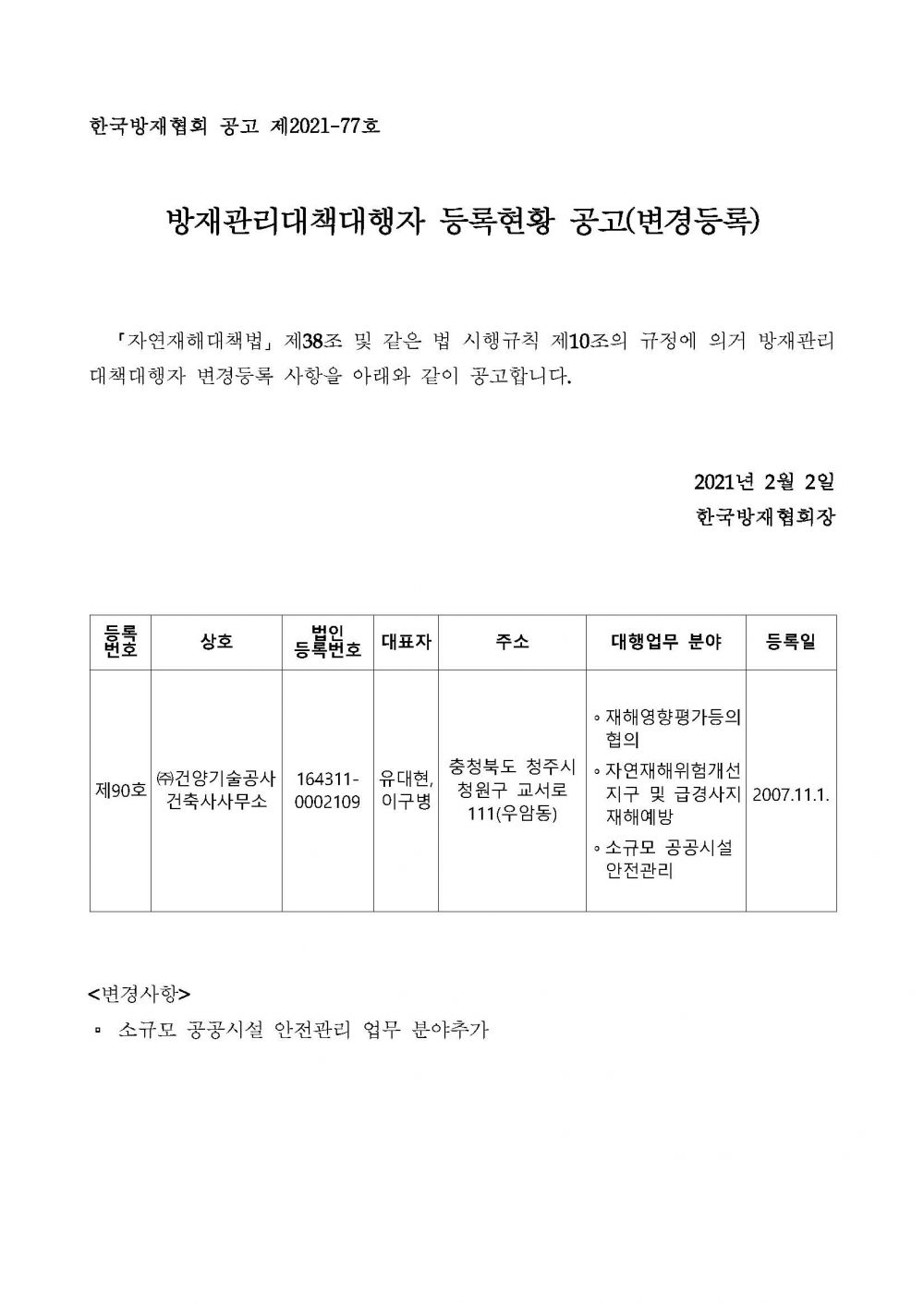 방재관리대책대행자 등록현황 공고(변경등록) - (주)건양기술공사건축사사무소 2021-02-04 공고문_제2021-77호_방재대행자 등록현황 공고(변경)_(주)건양기술공사건축사사무소.pdf (62407K) 목록보기 이전글방재관리대책대행자 등록현황 공고(변경등록) - (주)내경엔지니어링2021.02.25 다음글방재관리대책대행자 등록현황 공고(업무폐업) - (주)신성엔지니어링2021.02.01