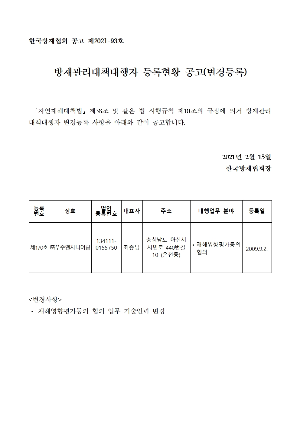 방재관리대책대행자 등록현황 공고(변경등록) - (주)우주엔지니어링 2021-02-22 공고문_제2021-93호_방재대행자 등록현황 공고(변경)_(주)우주엔지니어링.pdf (58271K) 목록보기 이전글방재관리대책대행자 등록현황 공고(변경등록) - (주)신오엔지니어링2021.03.11 다음글방재관리대책대행자 등록현황 공고(변경등록) - (주)건양기술공사건축사사무소2021.02.04