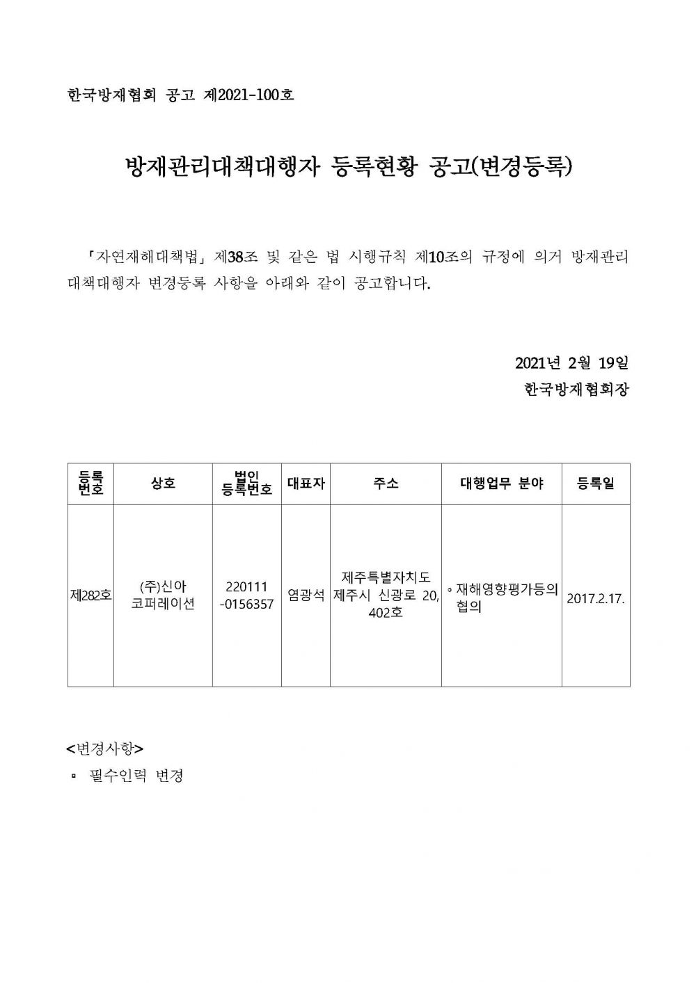 방재관리대책대행자 등록현황 공고(변경등록) -(주)신아코퍼레이션 2021-02-22 공고문_제2021-100호_방재대행자 등록현황 공고(변경)_(주)신아코퍼레이션.pdf (55233K) 목록보기 이전글방재관리대책대행자 등록현황 공고(업무휴업) - (주)한경기술공사2022.02.14