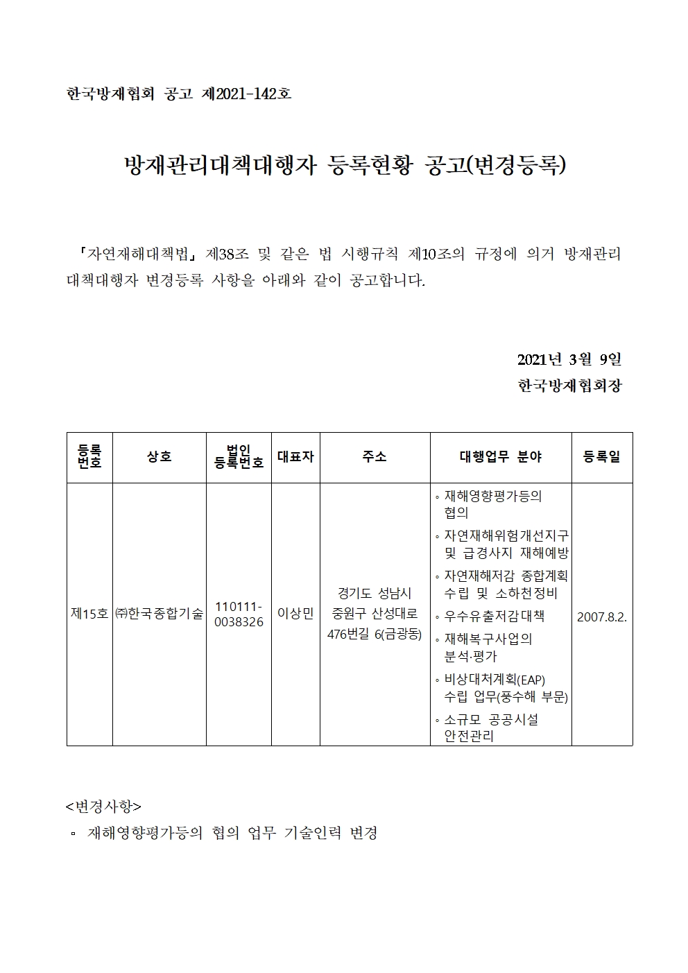 방재관리대책대행자 등록현황 공고(변경등록) - (주)한국종합기술 2021-03-11 공고문_제2021-142호_방재대행자 등록현황 공고(변경)_(주)한국종합기술.pdf (68802K) 목록보기 이전글방재관리대책대행자 등록현황 공고(업무폐업) - (주)삼영기술2021.04.01 다음글방재관리대책대행자 등록현황 공고(변경등록) - (주)대성종합엔지니어링건축사사무소2021.02.25