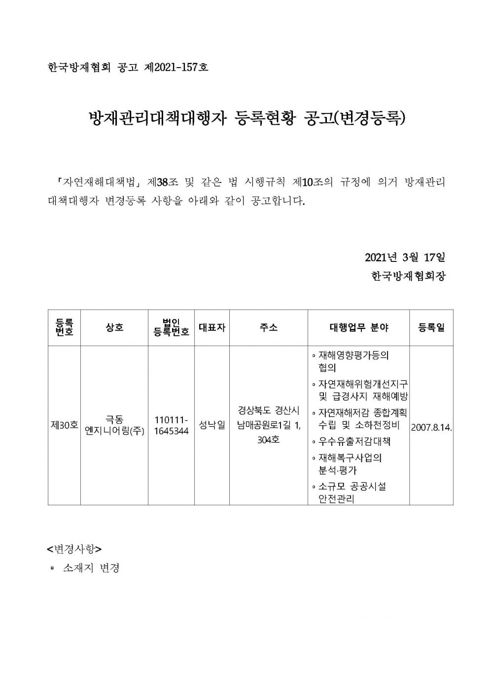 방재관리대책대행자 등록현황 공고(변경등록) - 극동엔지니어링(주) 2021-03-17 공고문_제2021-157호_방재대행자 등록현황 공고(변경)_극동엔지니어링(주).pdf (65096K) 목록보기 이전글방재관리대책대행자 등록현황 공고(업무폐업) - (주)삼영기술2021.04.01 다음글방재관리대책대행자 등록현황 공고(변경등록) - (주)대성종합엔지니어링건축사사무소2021.02.25