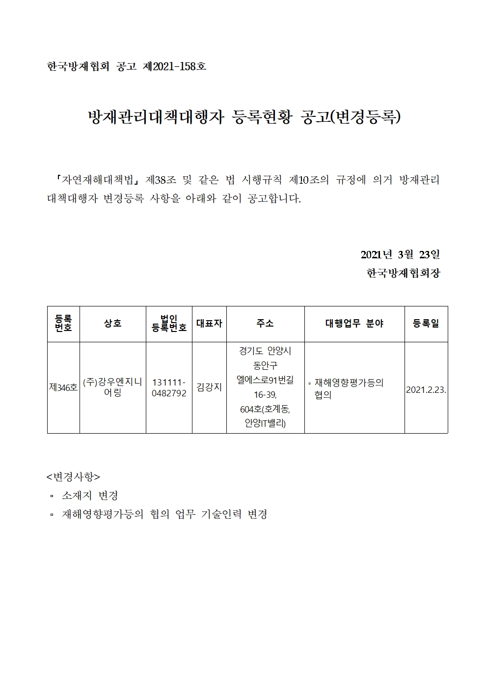 방재관리대책대행자 등록현황 공고(변경등록) - (주)강우엔지니어링 2021-03-23 공고문_제2021-158호_방재대행자 등록현황 공고(변경)_(주)강우엔지니어링.pdf (59177K) 목록보기 이전글방재관리대책대행자 등록현황 공고(변경등록) - (주)삼영기술2021.04.01 다음글방재관리대책대행자 등록현황 공고(변경등록) - (주)한국종합기술2021.03.11