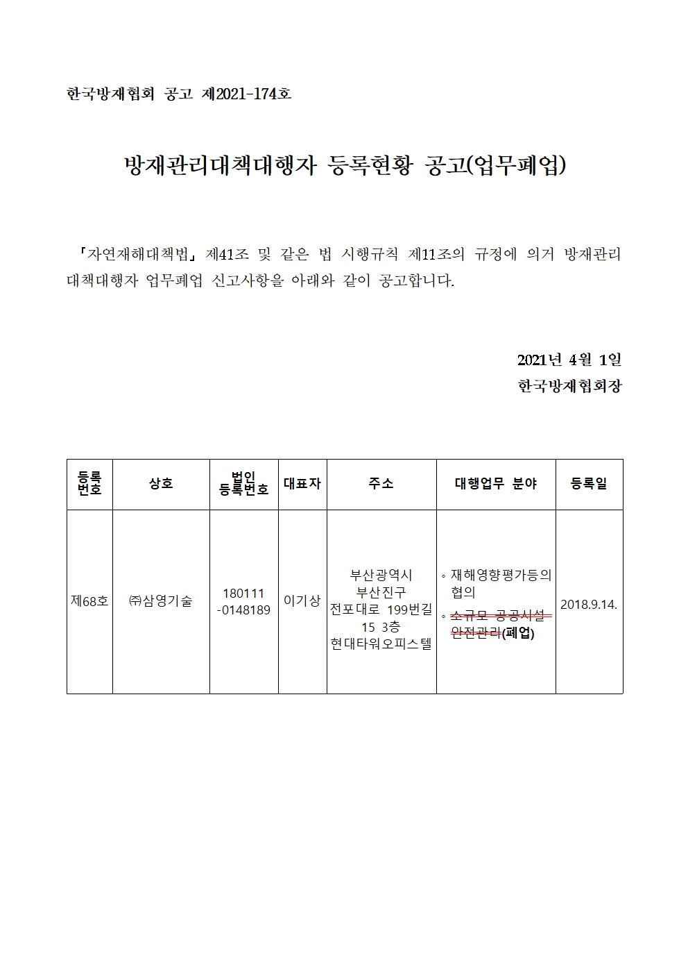 방재관리대책대행자 등록현황 공고(업무폐업) - (주)삼영기술 2021-04-01 공고문_제2021-175호_방재대행자 등록현황 공고(폐업)_(주)삼영기술.pdf (57701K) 목록보기 이전글방재관리대책대행자 등록현황 공고(변경등록) - (주)삼영기술2021.04.01 다음글방재관리대책대행자 등록현황 공고(변경등록) - (주)한국종합기술2021.03.11