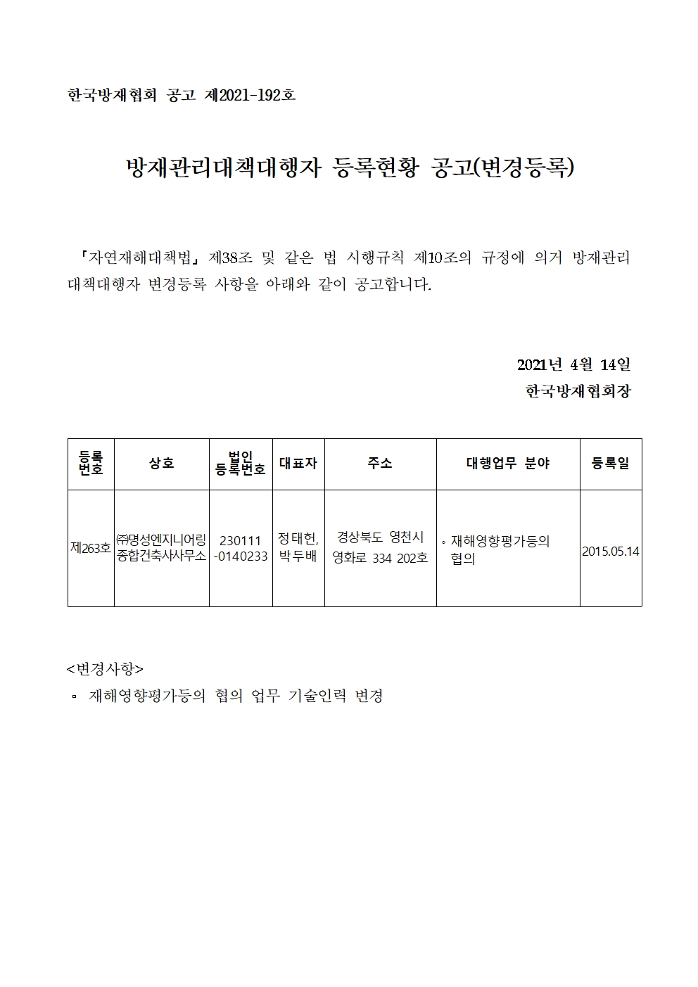 방재관리대책대행자 등록현황 공고(변경등록) - (주)명성엔지니어링종합건축사사무소 2021-04-14 공고문_제2021-192호_방재대행자 등록현황 공고(변경)_(주)명성엔지니어링종합건축사사무소.pdf (59107K) 목록보기 이전글방재관리대책대행자 등록현황 공고(변경등록) - (주)창미이엔지2021.04.23 다음글방재관리대책대행자 등록현황 공고(변경등록) - (주)대성종합엔지니어링건축사사무소2021.04.01
