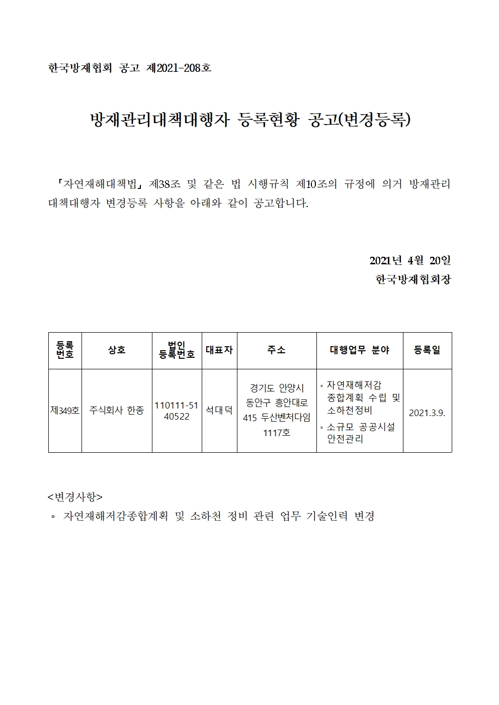 방재관리대책대행자 등록현황 공고(변경등록) - 주식회사 한종 2021-04-21 공고문_제2021-208호_방재대행자 등록현황 공고(변경)_주식회사 한종.pdf (61978K) 목록보기 이전글방재관리대책대행자 등록현황 공고(변경등록) - (주)해인엔지니어링건축사사무소2021.05.11 다음글방재관리대책대행자 등록현황 공고(변경등록) - (주)명성엔지니어링종합건축사사무소2021.04.14