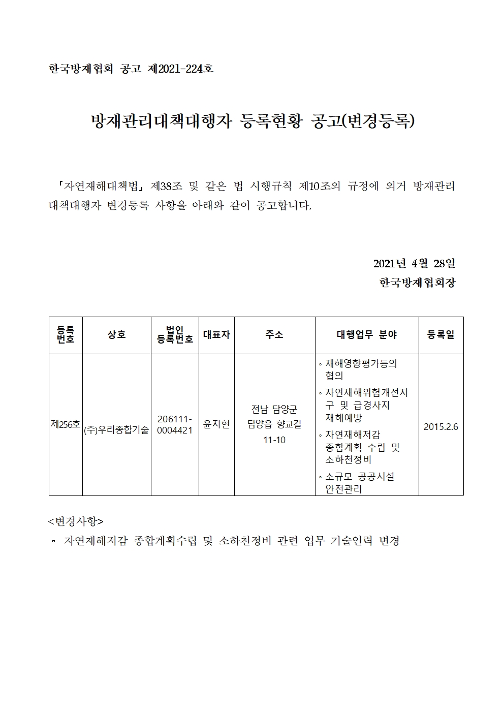 방재관리대책대행자 등록현황 공고(변경등록) - (주)우리종합기술 2021-04-29 공고문_제2021-224호_방재대행자 등록현황 공고(변경)_(주)우리종합기술.pdf (65046K) 목록보기 이전글방재관리대책대행자 등록현황 공고(변경등록) - (주)대영엔지니어링2021.05.24 다음글방재관리대책대행자 등록현황 공고(변경등록) - 주식회사 한종2021.04.21