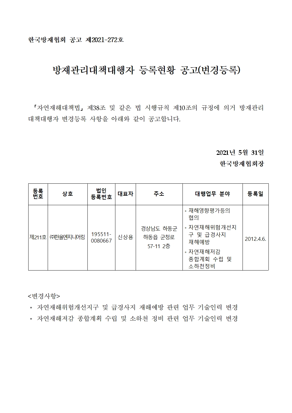 방재관리대책대행자 등록현황 공고(변경등록) - (주)한올엔지니어링 2021-05-31 공고문_제2021-272호_방재대행자 등록현황 공고(변경)_(주)한올엔지니어링.pdf (66221K) 목록보기 이전글방재관리대책대행자 등록현황 공고(업무휴업) - (주)동해종합기술공사2021.06.21 다음글방재관리대책대행자 등록현황 공고(업무재개) - (주)대영엔지니어링2021.05.24