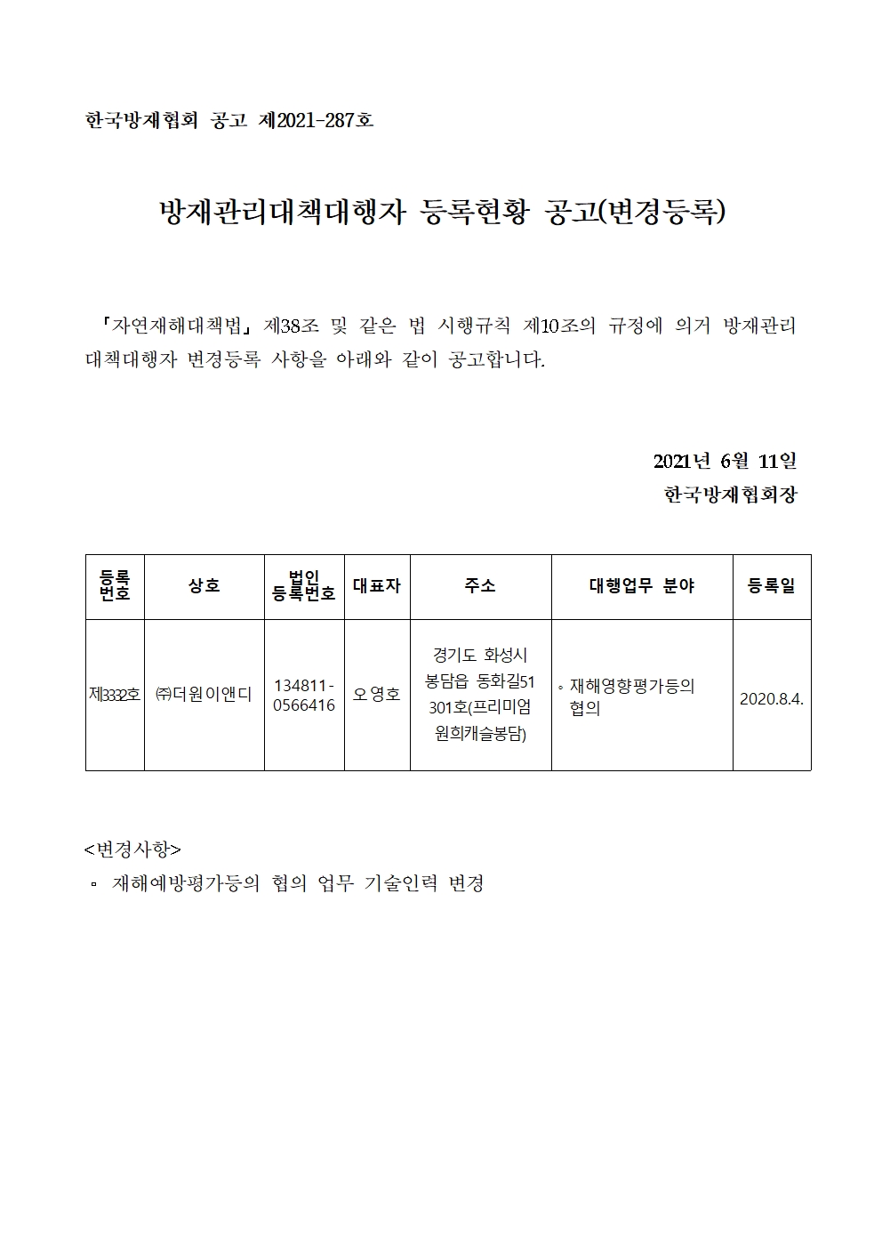 방재관리대책대행자 등록현황 공고(변경등록) - (주)더원이앤디 2021-06-14 공고문_제2021-287호_방재대행자 등록현황 공고(변경)_(주)더원이앤디.pdf (58349K) 목록보기 이전글방재관리대책대행자 등록현황 공고(업무휴업) - (주)동해종합기술공사2021.06.21 다음글방재관리대책대행자 등록현황 공고(업무재개) - (주)대영엔지니어링2021.05.24