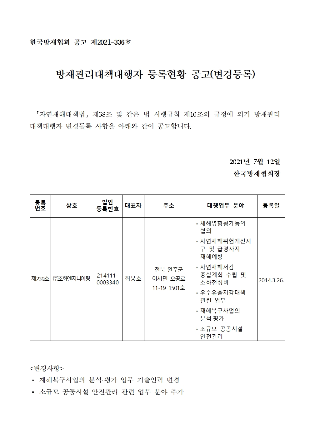 방재관리대책대행자 등록현황 공고(변경등록) - (주)조화엔지니어링 2021-07-12 공고문_제2021-336호_방재대행자 등록현황 공고(변경)_(주)조화엔지니어링.pdf (69872K) 목록보기 이전글방재관리대책대행자 등록현황 공고(변경등록) - (주)대한2021.07.22 다음글방재관리대책대행자 등록현황 공고(변경등록) - (주)평화엔지니어링2021.07.05