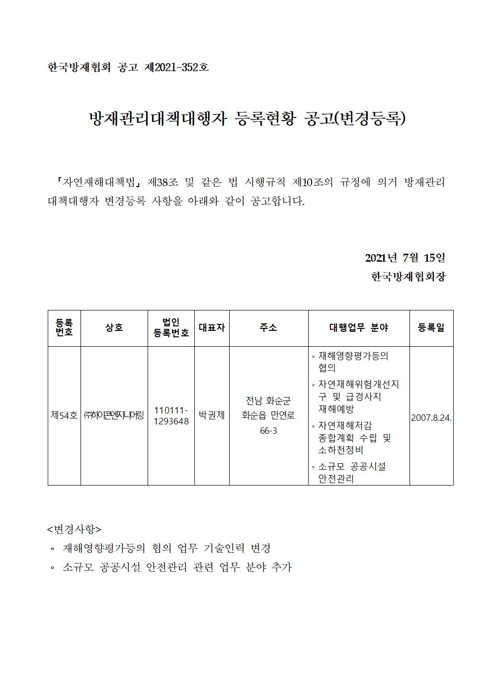 방재관리대책대행자 등록현황 공고(변경등록) - (주)하이콘엔지니어링 2021-07-15 공고문_제2021-356호_방재대행자 등록현황 공고(변경)_(주)하이콘엔지니어링.pdf (66386K) 목록보기 이전글방재관리대책대행자 등록현황 공고(변경등록) - (주)국성건설엔지니어링2021.07.28 다음글방재관리대책대행자 등록현황 공고(변경등록) - (주)조화엔지니어링2021.07.12