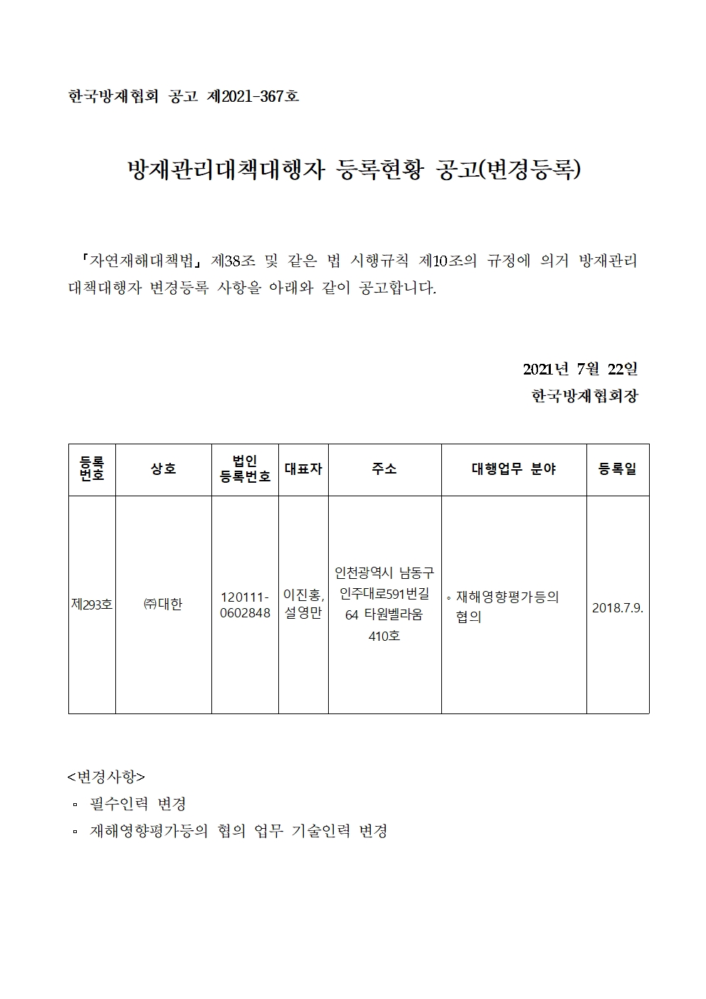 방재관리대책대행자 등록현황 공고(변경등록) - (주)대한 2021-07-22 공고문_제2021-367호_방재대행자 등록현황 공고(변경)_(주)대한.pdf (59494K) 목록보기 이전글방재관리대책대행자 등록현황 공고(변경등록) - (주)국성건설엔지니어링2021.07.28 다음글방재관리대책대행자 등록현황 공고(변경등록) - (주)조화엔지니어링2021.07.12