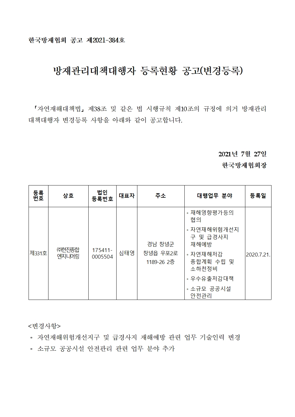 방재관리대책대행자 등록현황 공고(변경등록) - (주)현진종합엔지니어링 2021-07-28 공고문_제2021-384호_방재대행자 등록현황 공고(변경)_(주)현진종합엔지니어링.pdf (68257K) 목록보기 이전글방재관리대책대행자 등록현황 공고(업무폐업) - 한국수자원공사2021.09.09 다음글방재관리대책대행자 등록현황 공고(변경등록) - (주)한성개발공사2021.07.22