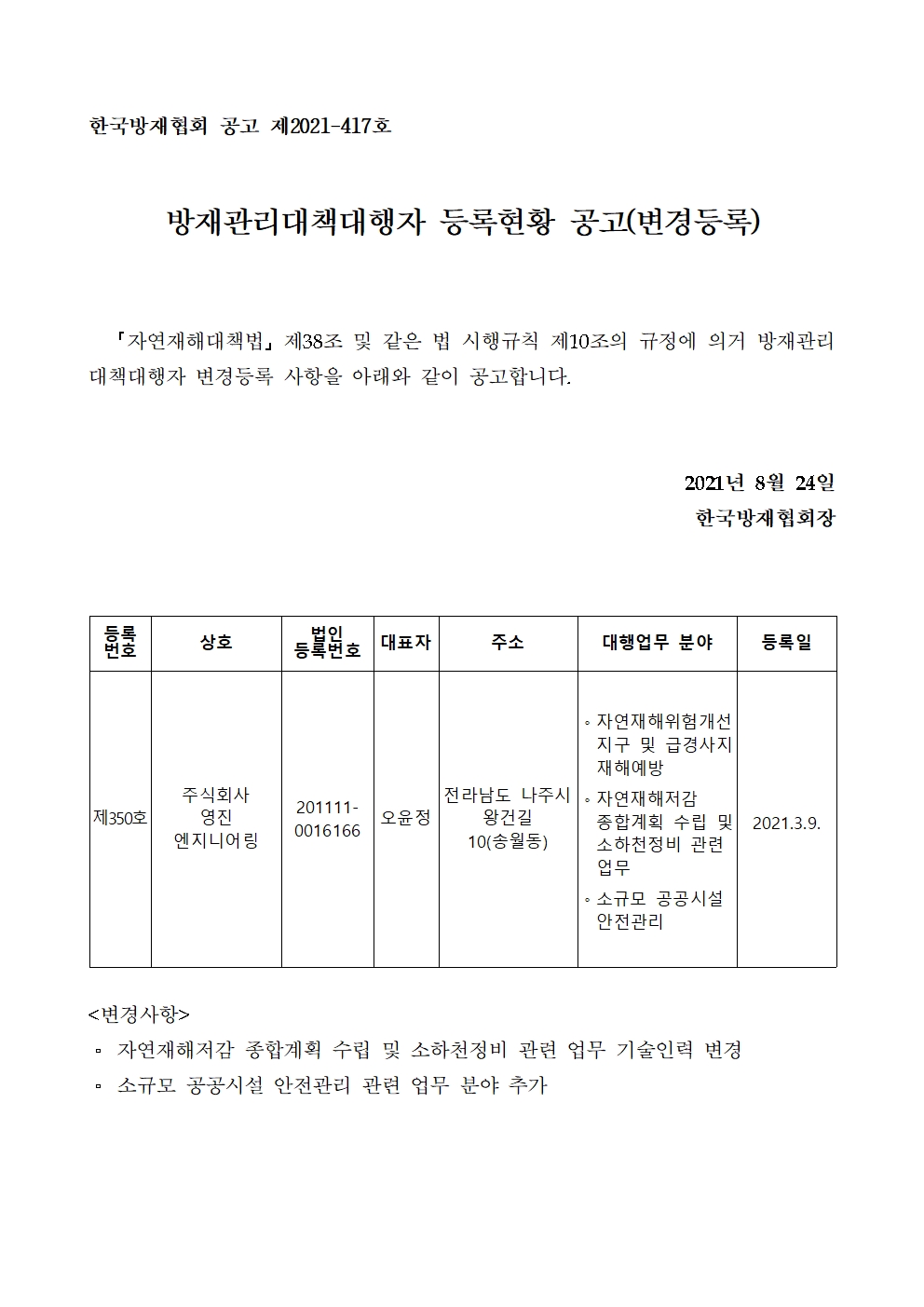방재관리대책대행자 등록현황 공고(변경등록) - 주식회사 영진엔지니어링 2021-08-24 공고문_제2021-417호_방재대행자 등록현황 공고(변경)_주식회사 영진엔지니어링.pdf (67727K) 목록보기 이전글방재관리대책대행자 등록현황 공고(신규등록) - (주)태성종합기술2021.10.01 다음글방재관리대책대행자 등록현황 공고(변경등록) - (주)현진종합엔지니어링2021.07.28