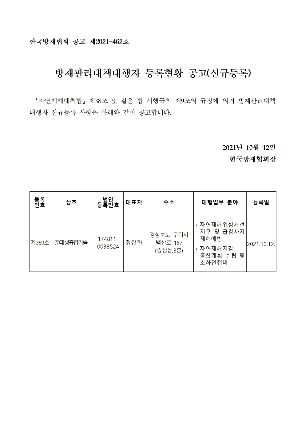 방재관리대책대행자 등록현황 공고(신규등록) - (주)태성종합기술 2021-10-01 공고문_제2021-462호_방재대행자 등록현황 공고(신규)_(주)태성종합기술.pdf (57796K) 목록보기 이전글방재관리대책대행자 등록현황 공고(변경등록) - (주)거원엔지니어링2021.10.13 다음글방재관리대책대행자 등록현황 공고(변경등록) - 주식회사 영진엔지니어링2021.08.24