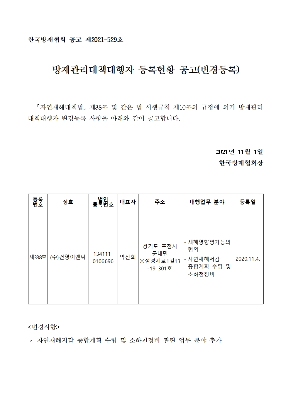 방재관리대책대행자 등록현황 공고(변경등록) - (주)건영이앤씨 2021-11-01 공고문_제2021-529호_방재대행자 등록현황 공고(변경)_(주)건영이엔씨.pdf (62021K) 목록보기 이전글방재관리대책대행자 등록현황 공고(변경등록) - (주)원우기술개발2021.11.08 다음글방재관리대책대행자 등록현황 공고(변경등록) - (주)전엔지니어링2021.10.20