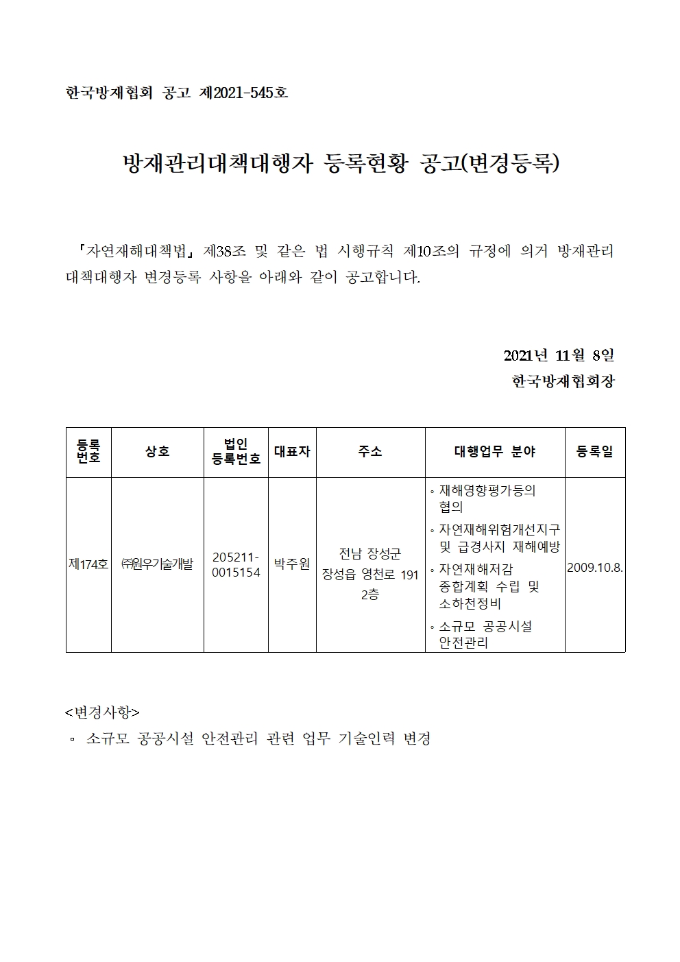 방재관리대책대행자 등록현황 공고(변경등록) - (주)원우기술개발 2021-11-08 공고문_제2021-545호_방재대행자 등록현황 공고(변경)_(주)원우기술개발001.jpg (269437K) 목록보기 이전글방재관리대책대행자 등록현황 공고(변경등록) - 주식회사 금성기술2021.11.16 다음글방재관리대책대행자 등록현황 공고(업무폐업) - 산이건설(주)2021.10.25