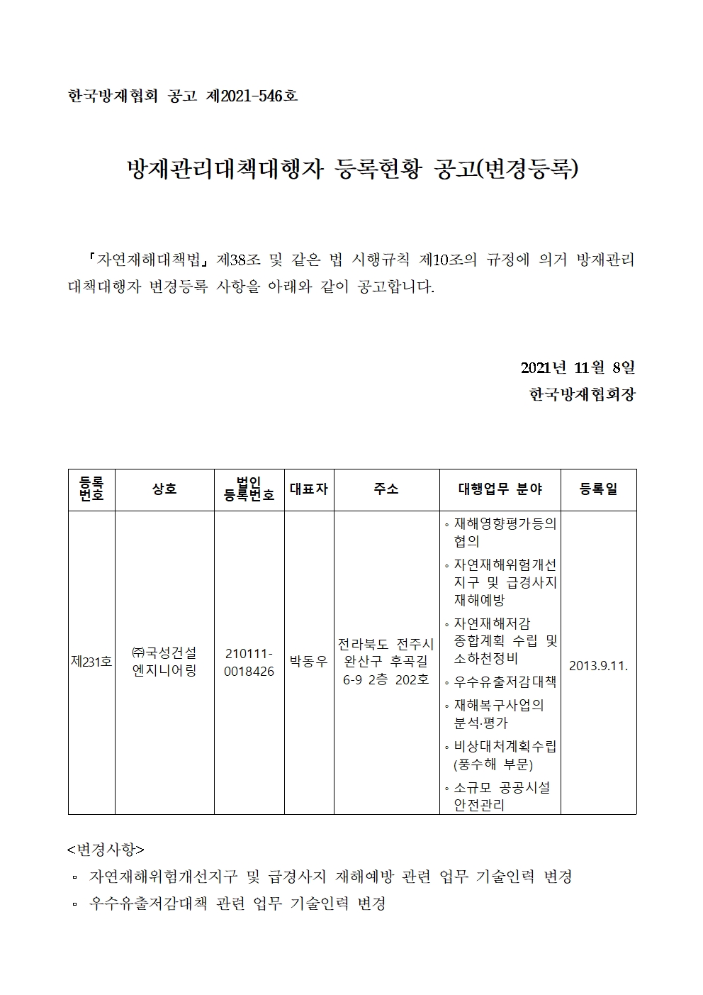 방재관리대책대행자 등록현황 공고(변경등록) - (주)국성건설엔지니어링 2021-11-08 공고문_제2021-546호_방재대행자 등록현황 공고(변경)_(주)국성건설엔지니어링.pdf (70327K) 목록보기 이전글방재관리대책대행자 등록현황 공고(변경등록) - 주식회사 한종2021.11.22 다음글방재관리대책대행자 등록현황 공고(변경등록) - 주식회사 그린기술공사2021.11.01