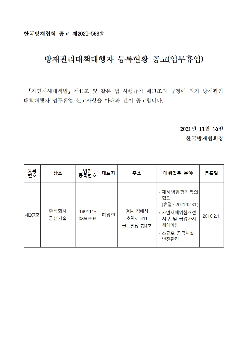방재관리대책대행자 등록현황 공고(변경등록) - 주식회사 금성기술 2021-11-16 공고문_제2021-563호_방재대행자 등록현황 공고(휴업)_주식회사 금성기술.pdf (59270K) 목록보기 이전글방재관리대책대행자 등록현황 공고(변경등록) - (주)한성개발공사2021.11.30 다음글방재관리대책대행자 등록현황 공고(변경등록) - (주)국성건설엔지니어링2021.11.08