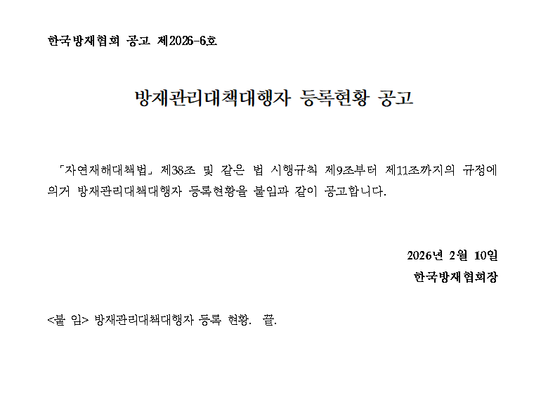 방재관리대책대행자 등록현황 공고(2026.02.) 2026-02-10 (공고문)방재관리대책대행자 등록현황 공고_260210.pdf (27K) 2. 방재관리대책대행자 등록 업체 현황(ver2)_260210.xlsx (123K) 목록보기 이전글방재관리대책대행자 등록현황 공고(2026.03.)2026.03.10 다음글방재관리대책대행자 등록현황 공고(2026.01.)2026.01.12