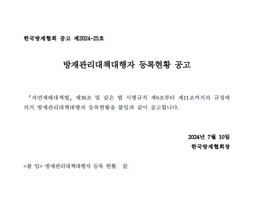 방재관리대책대행자 등록현황 공고(2024.7.) 2024-07-10 (공고문)방재관리대책대행자 등록현황 공고_240710.pdf (27751K) 방재관리대책대행자 등록 업체 현황(배포용)_240709.xlsx (103314K) 목록보기 이전글방재관리대책대행자 등록현황 공고(2024.8.)2024.08.09 다음글방재관리대책대행자 등록현황 공고(2024.6.)2024.06.10