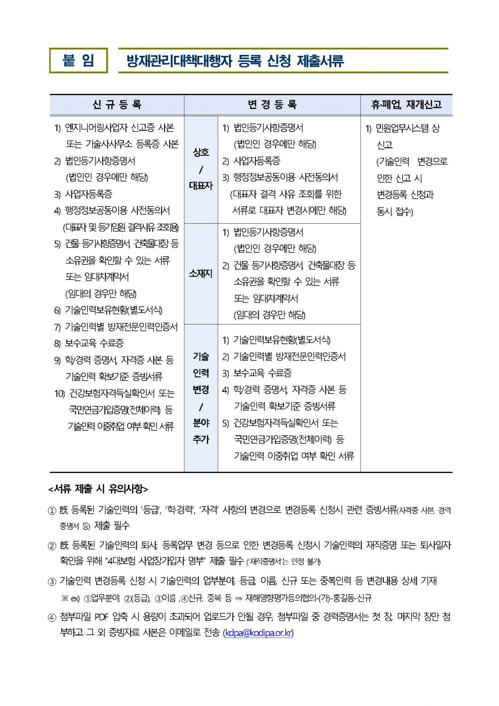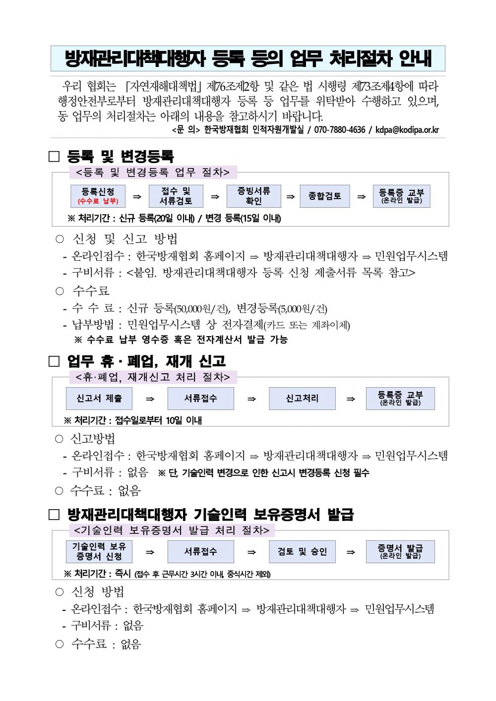 방재관리대책대행자 민원업무 처리절차 및 제출서류 안내 2021-08-10 방재관리대책대행자 문의 02-3472-8072 방재관리대책대행자 민원업무 처리절차(대행자 안내용).pdf (305732K) 목록보기 이전글방재관리대책대행자 등록 현황 공고(2025.8.)2025.08.11 다음글방재관리대책대행자 등록현황 공고(2025.7.)2025.07.10