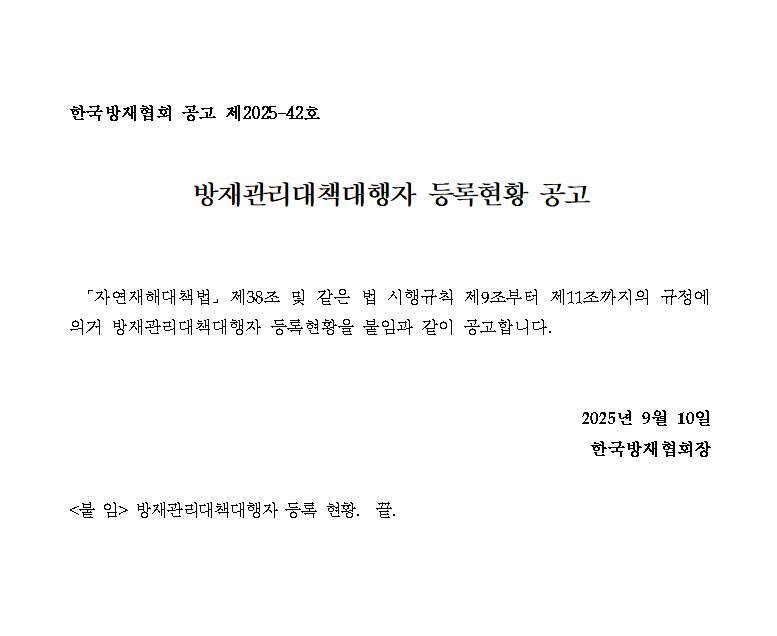 방재관리대책대행자 등록현황 공고(2025.9.) 2025-09-10 (공고문)방재관리대책대행자 등록현황 공고_250910.pdf (27K) 2. 방재관리대책대행자 등록 업체 현황(ver2)_250910.xlsx (116K) 목록보기 이전글방재관리대책대행자 민원업무시스템 접속 불가에 따른 민원업무 처리 안내('25.9.26~)2025.09.29 다음글방재관리대책대행자 등록 현황 공고(2025.8.)2025.08.11