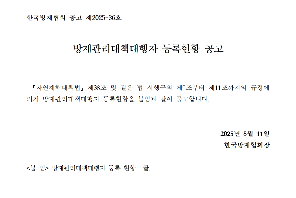 방재관리대책대행자 등록 현황 공고(2025.8.) 2025-08-11 (공고문)방재관리대책대행자 등록현황 공고_250811.pdf (27K) 2. 방재관리대책대행자 등록 업체 현황(ver2)_250811.xlsx (115K) 목록보기 이전글방재관리대책대행자 등록현황 공고(2025.9.)2025.09.10 다음글방재관리대책대행자 민원업무 처리절차 및 제출서류 안내2021.08.10