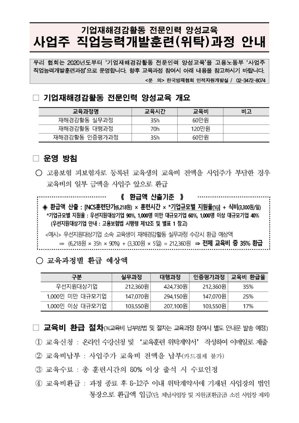 교육비 환급 안내(사업주 직업능력개발훈련 안내) 2020-01-30 220104_교육훈련위탁계약서(양식).hwp (109568K) 목록보기 이전글코로나19 관련 교육일정 변경 안내2020.02.27 다음글2018년 제1회 기업재난관리사 실무과정 개설 안내2018.04.10
