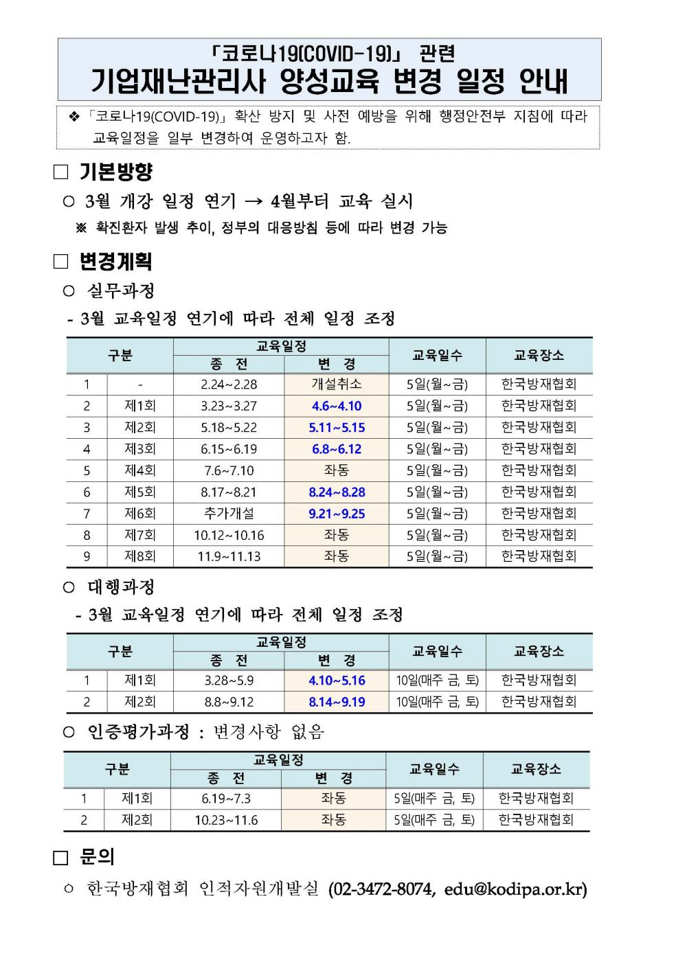 코로나19 관련 교육일정 변경 안내 2020-02-27 목록보기 이전글코로나19 관련 기업재난관리사 양성교육 교육일정 재변경 안내 (20.3.27)2020.03.27 다음글교육비 환급 안내(사업주 직업능력개발훈련 안내)2020.01.30