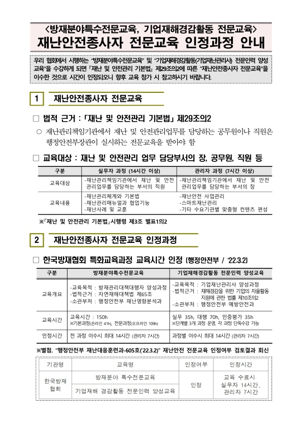 재난안전종사자 전문교육 인정과정 안내(기업재난관리사 전문교육) 2021-05-13 220430_재난안전종사자 전문교육_인정과정 안내.pdf (161628K) 목록보기 이전글2021년 기업재난관리사 인증시험 일정 안내2021.06.09 다음글2020년 기업재난관리사 인증시험 일정 안내2020.05.13