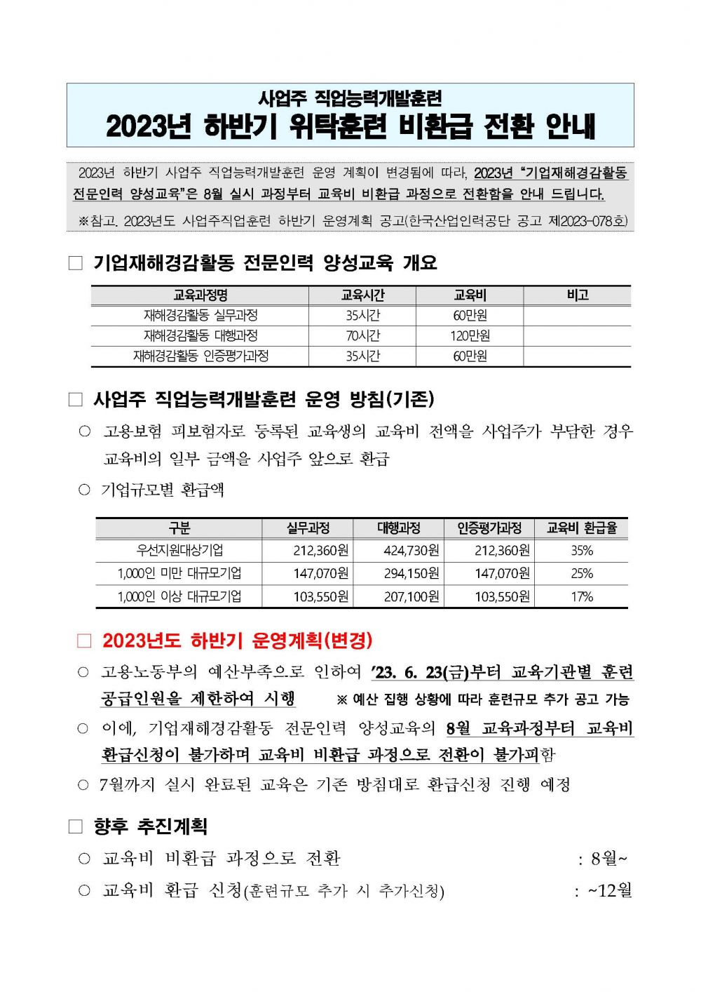2023년 하반기 기업재해경감활동 전문인력 양성교육 교육비 비환급 안내 2023-07-27 2023년 하반기 기업재해경감활동 전문인력 양성교육 교육비 비환급 안내.pdf (96407K) (공고 제2023-078호) 2023년도 사업주직업훈련 하반기 운영계획 공고(최종).pdf (185695K) 목록보기 이전글2023년 사업주 직업능력개발훈련 지원금 지급 유예 안내2023.12.21 다음글2023년도 기업재난관리사 인증시험 시행계획2023.03.02