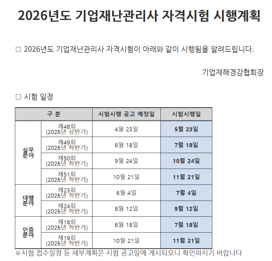 아래와 같이 2026도 기업재난관리사 인증시험 일정을 안내 드리니, 참고하시어 응시하시기 바랍니다.