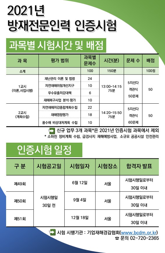 2021년 방재전문인력 인증시험 일정 2021-02-10 목록보기 이전글제49회 방재전문인력 인증시험 시행공고(시행일 6.12)2021.05.12 다음글제48회 방재전문인력 인증시험 시행공고(시행일 12.19)2020.11.20