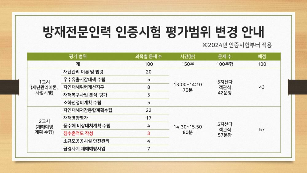 방재전문인력 인증시험 평가범위 변경 안내(2024년 시험부터 적용) 2024-02-06 목록보기 이전글2025년도 방재전문인력 인증시험 일정(안)2025.02.12 다음글방재관리대책대행자 등록 요건(자연재해대책법 시행령 별표3)2024.01.18