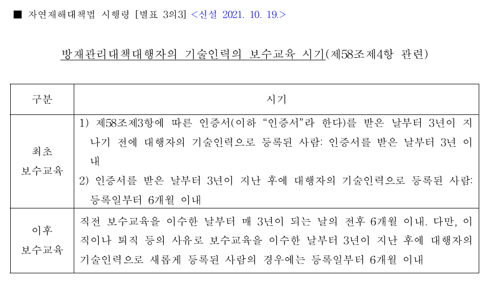방재관리대책대행자의 기술인력의 보수교육 시기(자연재해대책법 시행령 별표 3의3, 시행 2022. 6. 9.> 2021-11-09 2022년 6월 9일부터 시행되는 자연재해대책법 시행령 별표 3의3(제58조제4항 관련)입니다. [별표 3의3] 방재관리대책대행자의 기술인력의 보수교육 시기(제58조제4항 관련)(자연재해대책법 시행령).pdf (64151K) 목록보기 이전글[수료증]교육수료증 사본 요청 방법 안내2022.12.27 다음글방재전문인력 보수교육 교육비 환급 안내(2024년 1월~)2024.01.18