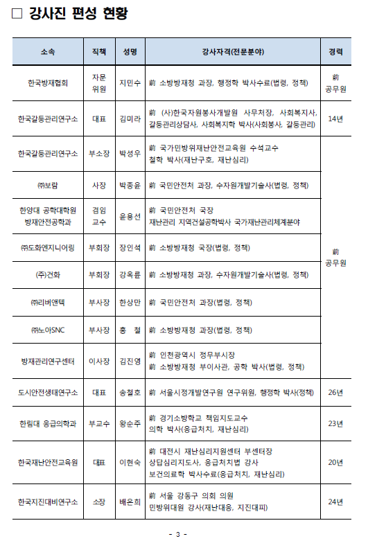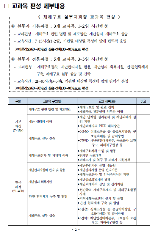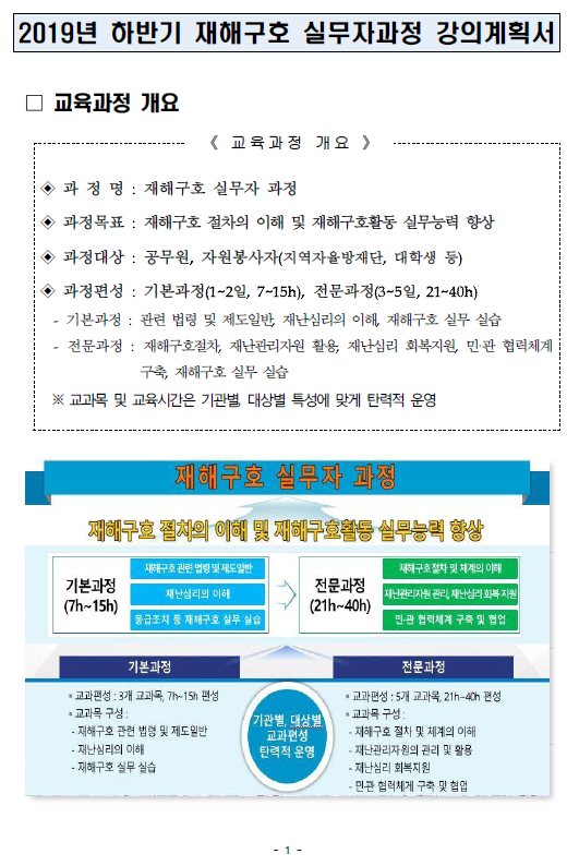 2019년 하반기 재해구호전문인력 양성교육 강의계획서(실무자) 2019-09-30 2019년 하반기 재해구호전문인력 양성교육(실무자과정) 강의계획서를 첨부하오니 참고하시기 바랍니다. 목록보기 이전글2019년 하반기 재해구호전문인력 양성교육 강의계획서(관리자)2019.09.30 다음글기업재난관리사 국가자격 인정 안내2024.01.05