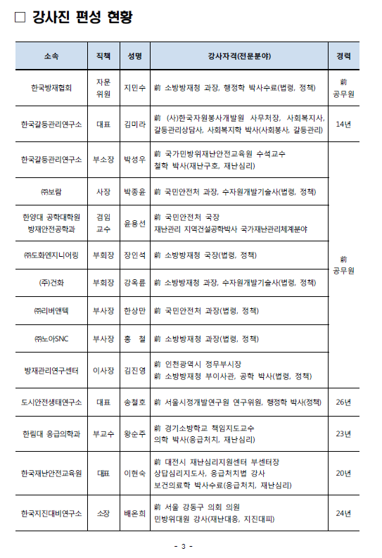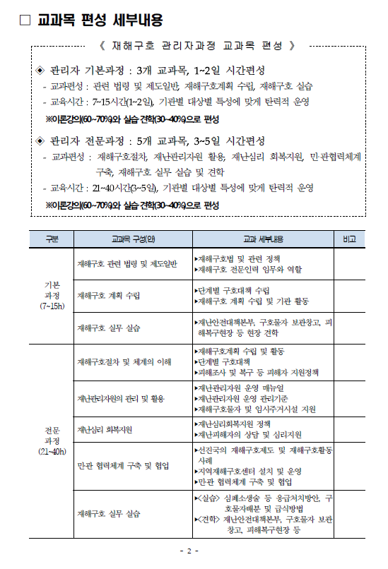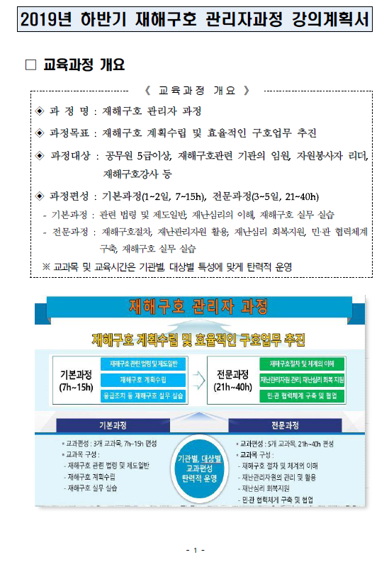 2019년 하반기 재해구호전문인력 양성교육 강의계획서(관리자) 2019-09-30 2019년 하반기 재해구호전문인력 양성교육(관리자과정) 강의계획서를 첨부하오니 참고하시기 바랍니다. 목록보기 이전글2020년도 재해구호 전문인력 양성교육 강의계획서(실무자과정)2020.01.30 다음글2019년 하반기 재해구호전문인력 양성교육 강의계획서(실무자)2019.09.30