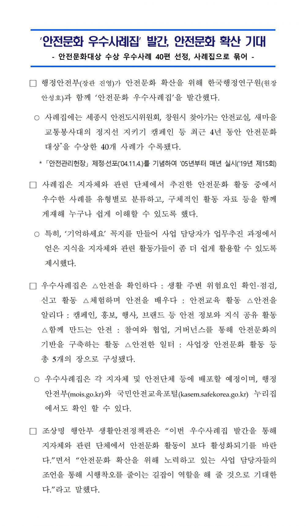 행정안전부 '안전문화 우수사례집' 발간, 안전문화 확산 기대 2020-01-14 2019 안전문화 우수사례집(행안부-한국행정연구원-게시용).pdf (17850700K) 목록보기 이전글제언 - 20202020.01.22 다음글정부. 1월 가뭄 예보 경보 발표2020.01.13
