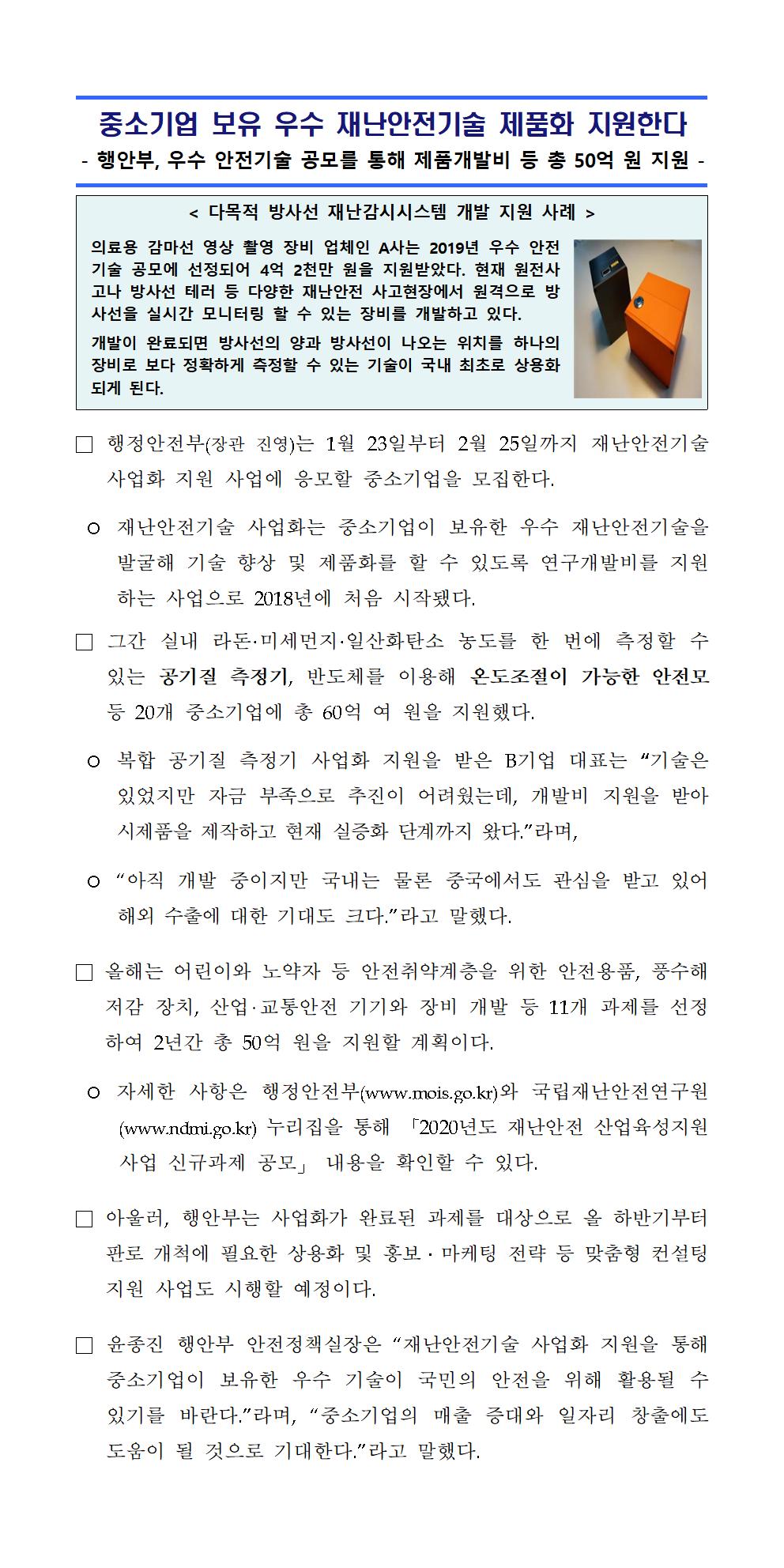 중소기업 보유 우수 재난안전기술 제품화 지원한다 2020-01-22 중소기업 보유 우수 재난안전기술 제품화 지원.pdf (291104K) 목록보기 이전글첨단과학 활용 재난안전기술 개발에 올해 654억 원 투자2020.01.28 다음글제언 - 20202020.01.22