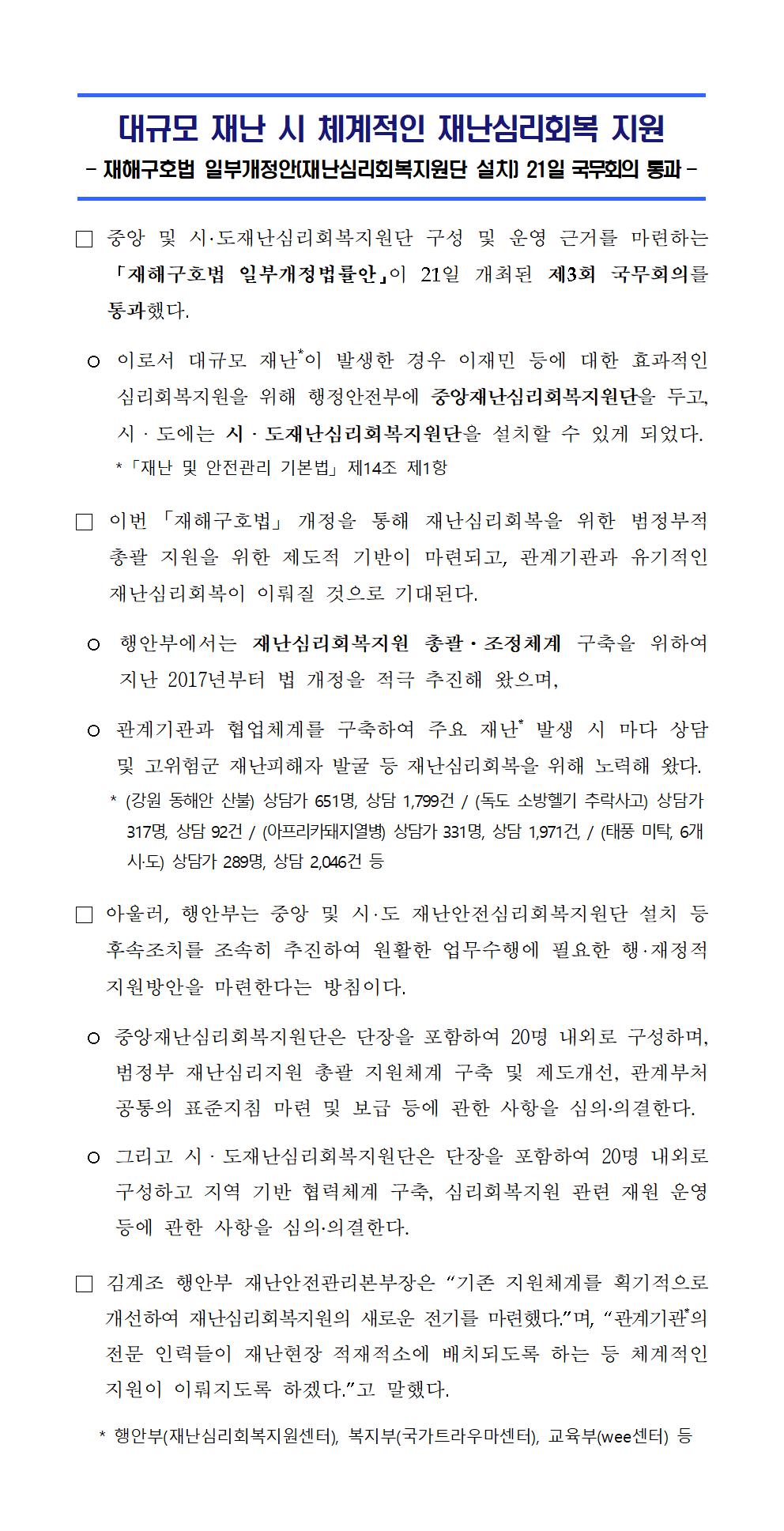 재해구호법 개정. 대규모 재난 시 체계적인 심리회복 지원 2020-01-28 200122 (참고) 재해구호법 개정. 대규모 재난 시 체계적인 심리회복 지원(재난구호과).pdf (179103K) 목록보기 이전글행안부, 신종코로나바이러스 확산 방지 총력 대응2020.01.28 다음글첨단과학 활용 재난안전기술 개발에 올해 654억 원 투자2020.01.28