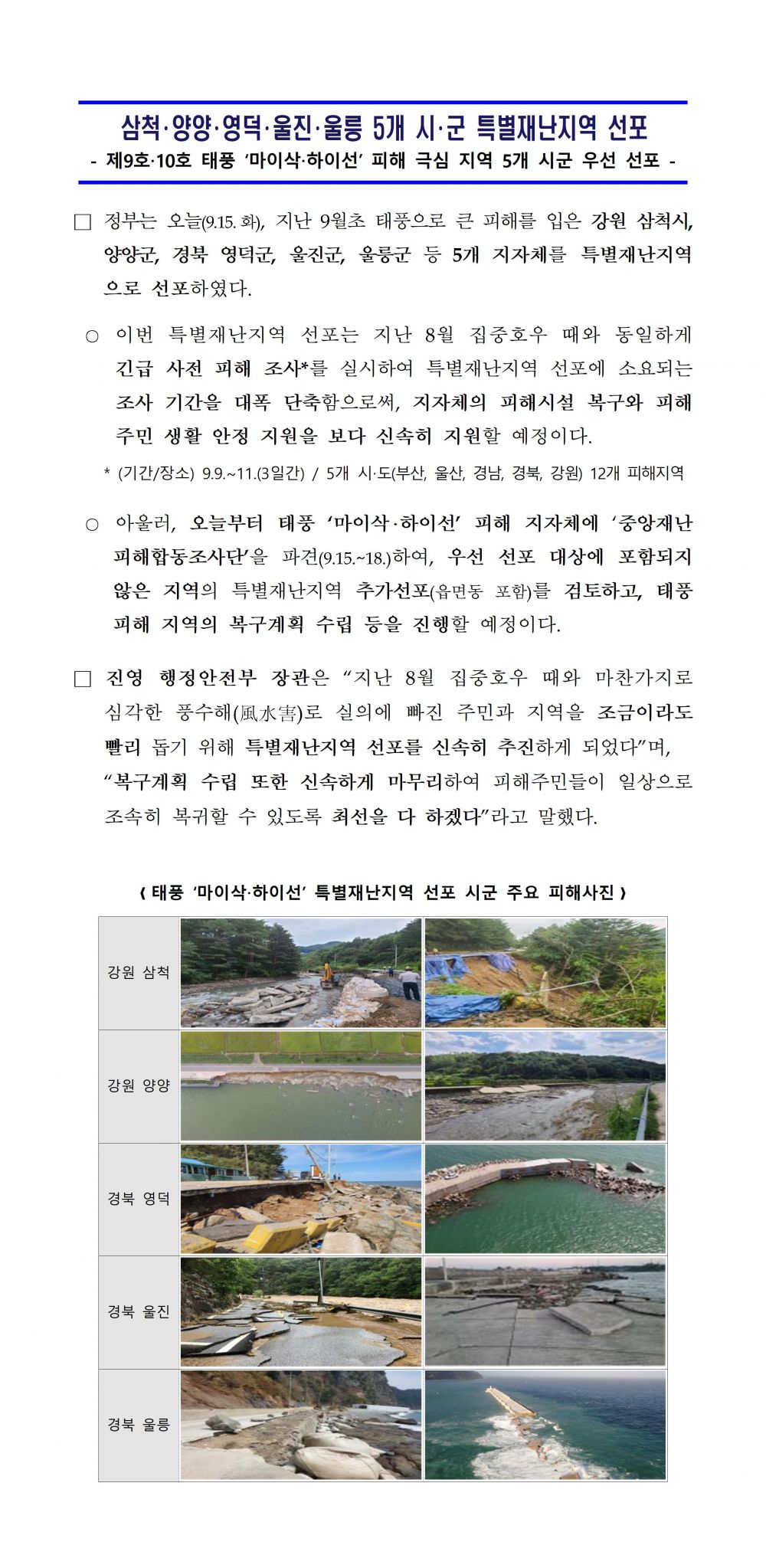 삼척·양양·영덕·울진·울릉 5개 시·군 특별재난지역 선포 2020-09-16 200915 (즉시) 삼척 양양 영덕 울진 울릉 5개 시군 특별재난지역 선포(복구지원과).hwp (1753090K) 목록보기 이전글2020 온라인 대한민국 안전산업박람회 개최 안내2020.09.22 다음글제언 - 인사만사(人事-萬事)2020.08.18