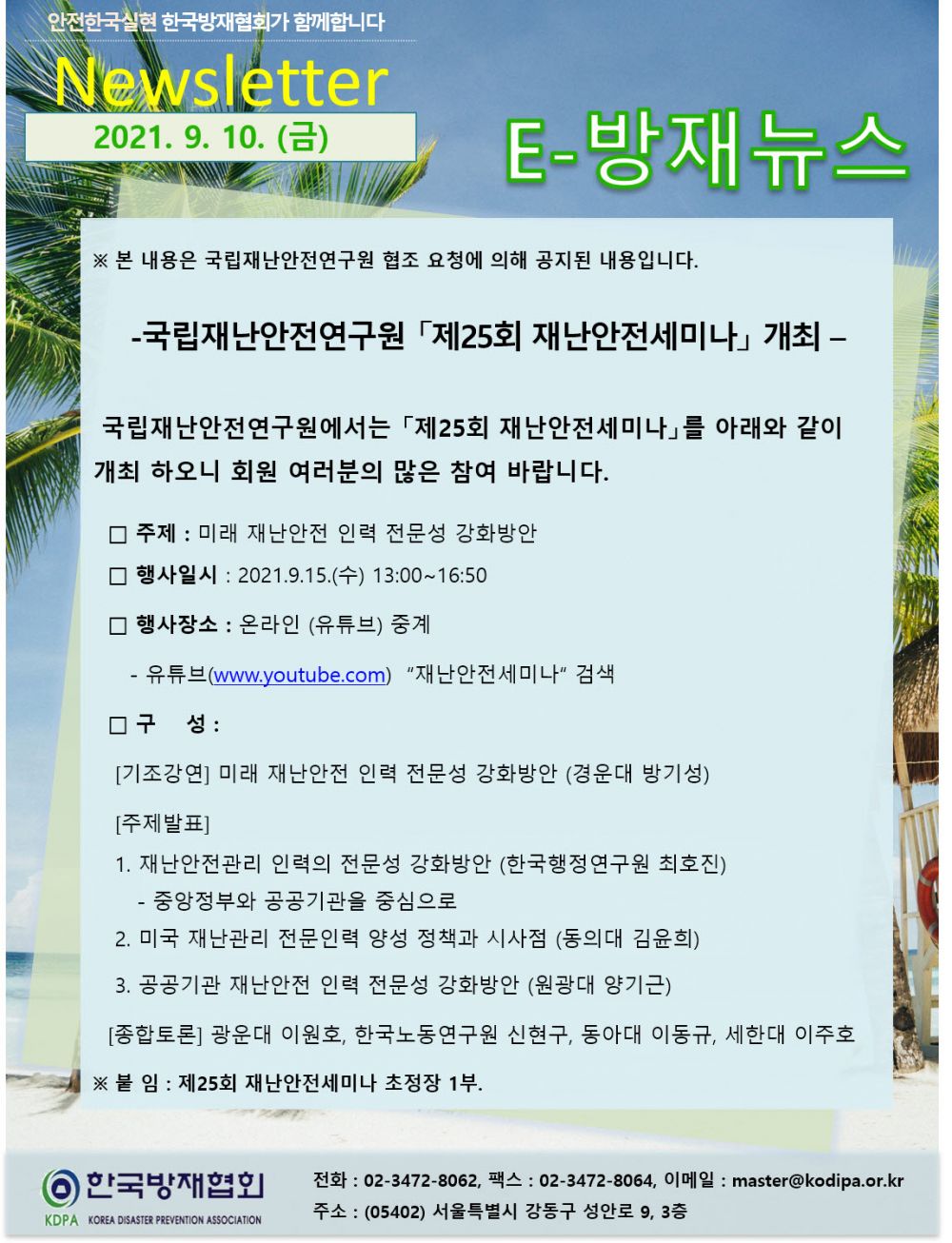 [국립재난안전연구원] 제25회 재난안전세미나 개최 2021-09-10 제25회 재난안전세미나 초청장.pdf (4557970K) 목록보기 이전글추워지는 날씨 한파에 건강 조심하세요2022.01.14 다음글인사혁신처 국가인재데이터DB 인물정보 등록 안내2021.06.14