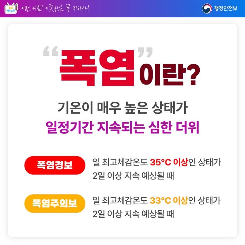 [카드뉴스] 이번 여름! 이것만은 꼭 지키자! <폭염 행동요령> 2025-07-14 목록보기 이전글재난관리 표준교재 배포 「재난계획론」 및 「재난대응론」2024.01.12 다음글폭염 행동요령, 건강한 여름나기를 위한 첫걸음!2025.07.14